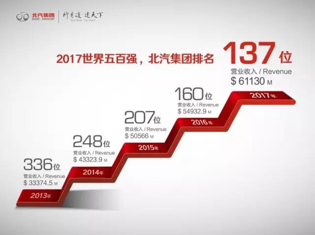 从2013年首次进入“世界500强企业”榜单,排名336位开始,北汽集团连续五年上榜,排名持续上升,五年提升199位。五年来,北汽集团抢抓发展机遇,明确发展战略,锚定发展目标,全力苦干实干,取得一系列跨越式发展。2012年北汽集团全年销售汽车170.1万辆,销售收入2100亿元,到2016年北汽集团已实现全年销售整车285万辆,营业收入突破4000亿元,业绩大幅上扬。