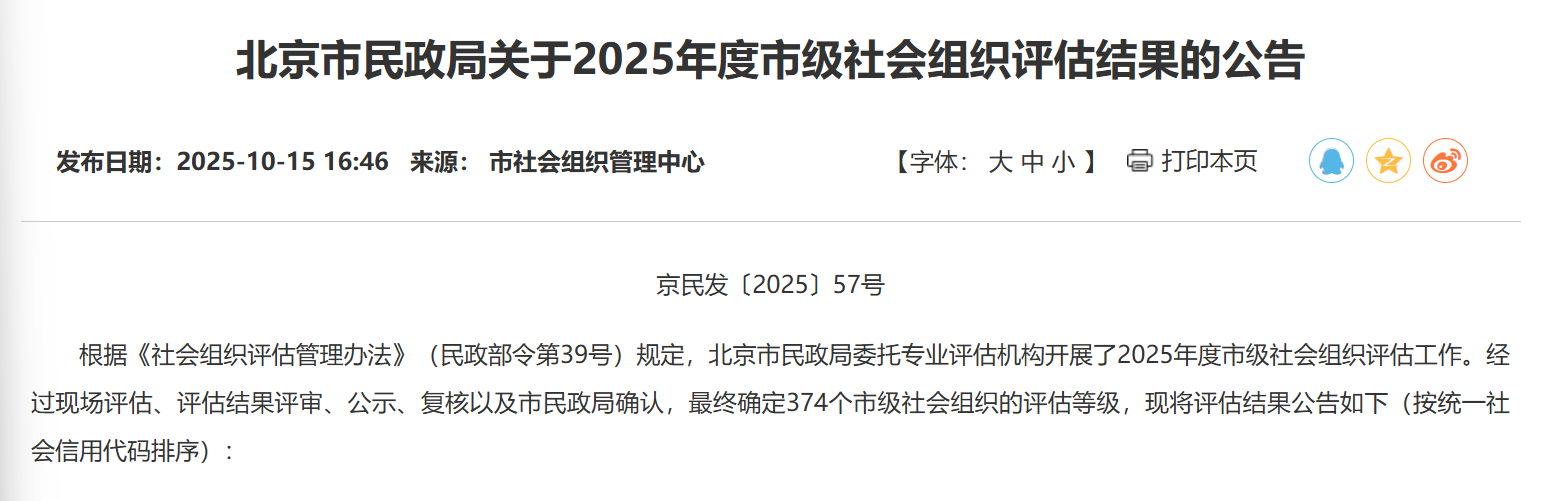 2025年10月15日,北京市民政局发布关于2025年度市级社会组织评估结果的公告。经过现场评估、评估结果评审、公示、复核以及市民政局确认,最终确定374个市级社会组织的评估等级。