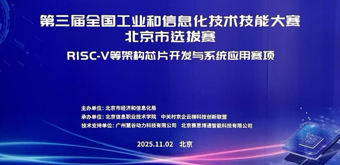 根据由工业和信息化部、人力资源社会保障部、教育部、中华全国总工会和共青团中央共同主办的2025年全国行业职业技能竞赛——第三届全国工业和信息化技术技能大赛,由北京市经济和信息化局主办,北京信息职业技术学院、中关村京企云梯科技创新联盟(简称:云梯联盟)承办,于2025年11月2日在北京信息职业技术学院成功举办了第三届全国工业和信息化技术技能大赛RISC-V等架构芯片开发与系统应用赛项北京市选拔赛。广州慧谷动力科技有限公司、北京赛思博通智能科技有限公司提供技术支持。