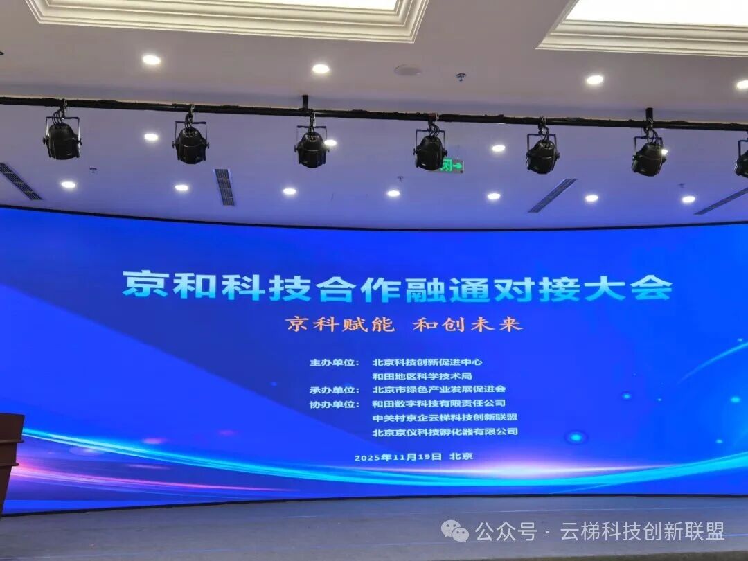 2025年11月19日下午,由北京科技创新促进中心与和田地区科学技术局联合主办,北京市绿色产业发展促进会承办,中关村京企云梯科技创新联盟(简称:云梯联盟)等单位协办的“京和科技合作融通对接大会”在北京成功举办。本次大会旨在推动北京与新疆和田地区间的科技合作与产业协同,促进首都丰富的科技创新资源与和田地区的实际产业需求实现精准对接。